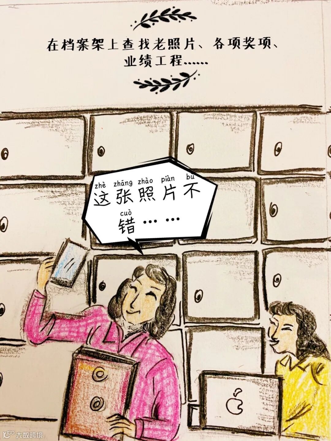 何玉梅与同事们一起在档案架上查找老照片、各项奖项、业绩工程等相关资料