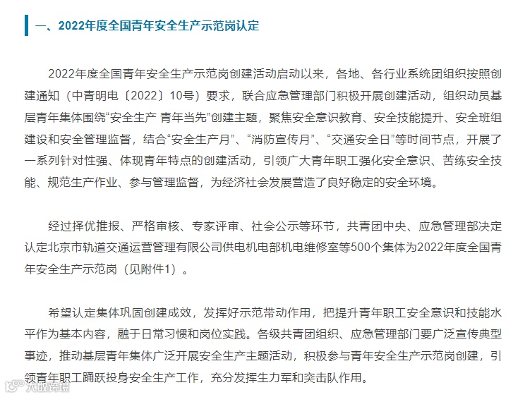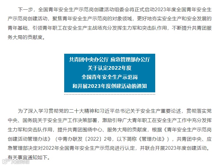 近日,共青团中央、应急管理部联合下发通知,公布了2022年度“全国青年安全生产示范岗”认定集体名单,晋江气电发电部、鸿山热电设备维护部电气专业经过层层选拔和严格评审成功入选。