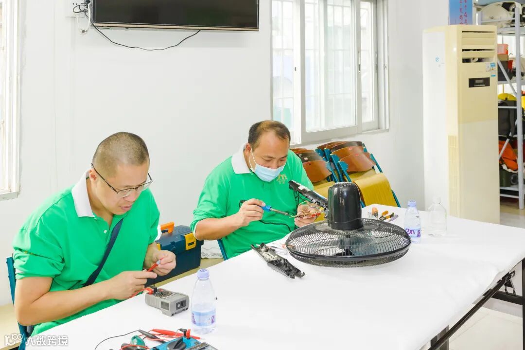 活动现场井然有序,支部党员代表、康乐部技师和工程部维修人员都身着绿色T恤,为社区老人提供温暖细致的服务,小家电维修区、肩颈理疗区、修脚区门庭若市。