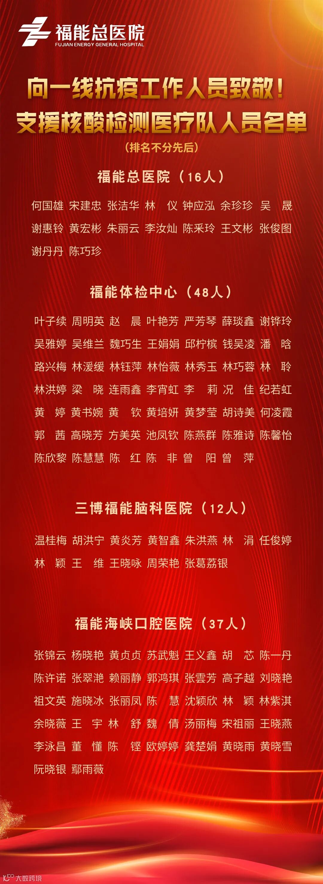 自10月23日以来,福能总医院、福能体检中心、三博福能脑科医院、福能海峡口腔医院先后派出200余人次,根据福州市新冠肺炎疫情防控指挥部统一安排,全力投身鼓楼区水部街道、后县新苑、福州大学至诚学院、温泉社区、西凤社区、凤凰池社区、金牛山公园;台江区新港街道、鳌峰街道、茶亭街道等全民核酸采样点支援核酸采样工作,完成了近10万人次的核酸检测任务,专业且优秀的工作表现深受群众认可。