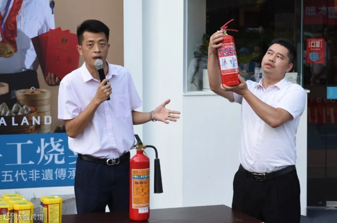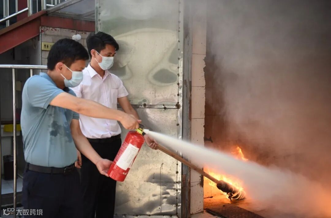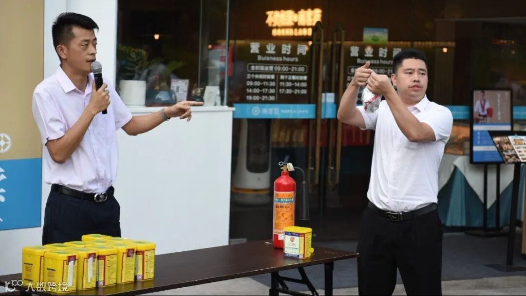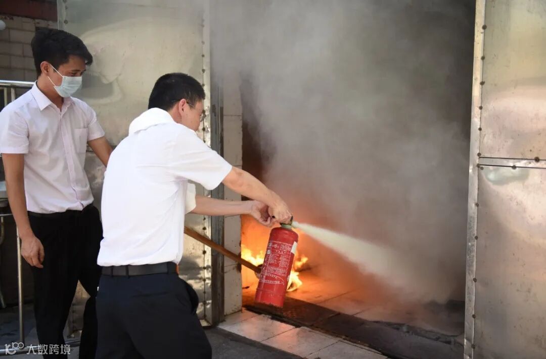 除了让员工们练习使用自救器之外,安保部也向员工们讲解了灭火器的正确使用方法,并进行火盆灭火演练。
