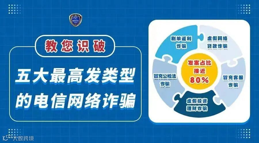 当前,电信网络诈骗犯罪形势严峻,已成为发案最多、上升最快、涉及面最广、人民群众反映最强烈的犯罪类型,其中刷单返利、虚假投资理财、虚假网络贷款、冒充客服、冒充公检法5种诈骗类型发案占比近80%,成为最为突出的5大高发类案。