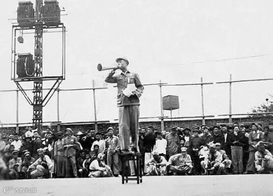 1952年,中国人保员工利用自制喇叭筒在广场上宣传保险。