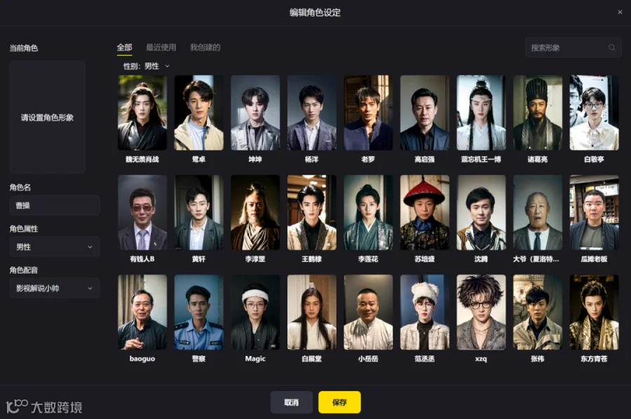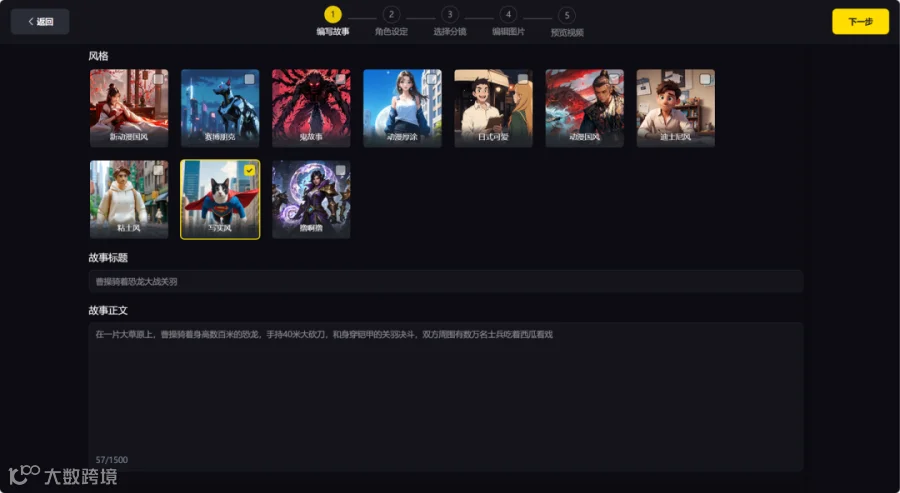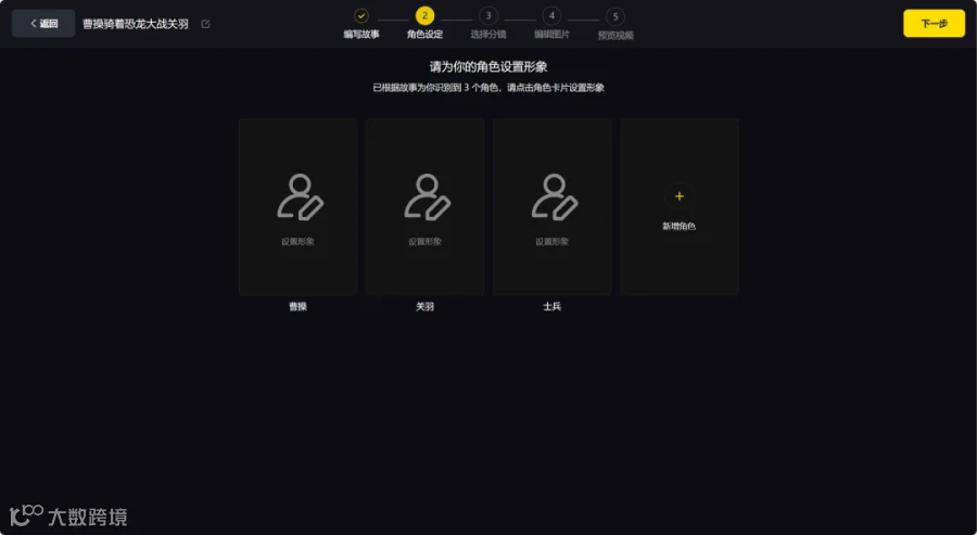 以"曹操骑着恐龙大战关羽"为例:输入故事标题及正文描述草原场景,系统自动识别"曹操""关羽""士兵"等角色。用户可定制各角色形象,通过"新增角色"补充人物设定。