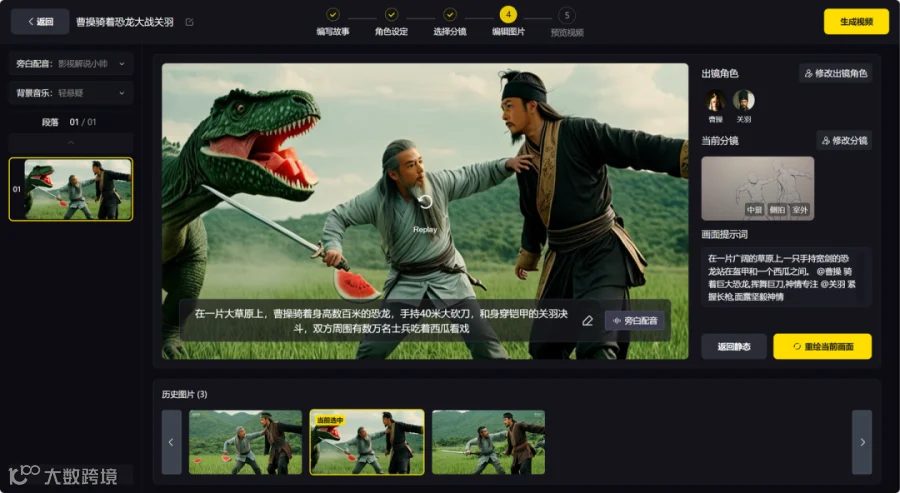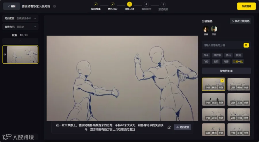 选择"战斗""骑马"等分镜模板,支持修改分镜旁白。若生成画面与预期不符,可通过完善"画面提示词"优化结果。最终生成视频作品。