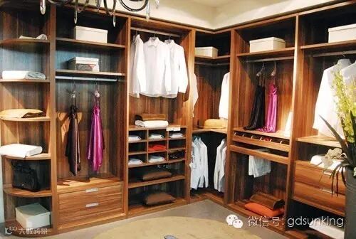 4.除了一些基本柜子,还可引入一些旋转式挂衣架、领带架以及下挂式挂杆、内置倾斜式鞋架等,其中旋转式挂衣架是近几年在国内比较流行的,它不仅节省空间,而且存挂量大,是传统衣柜的2至3倍。
