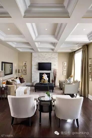 时尚的美式家居里面,电视占据中央,而把传统的壁炉简化设计移到一边,上方搭配上大面积的画幅装饰,让整个家居设计时尚、大方。