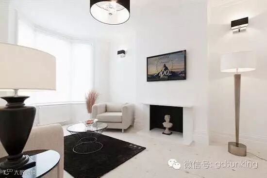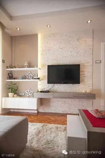 从宽敞的墙面中间再隔出一道阔长的白色的墙面,主体电视挂墙摆放在中间,左右两边再巧妙地运用平面几何的原理,适当打造几个摆放装饰的窗口。