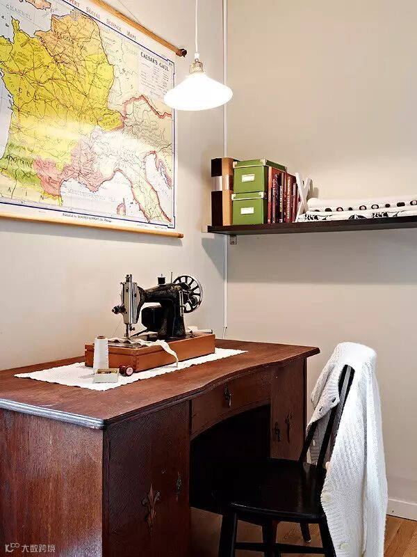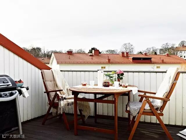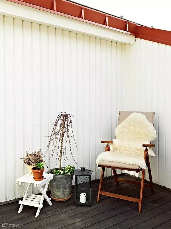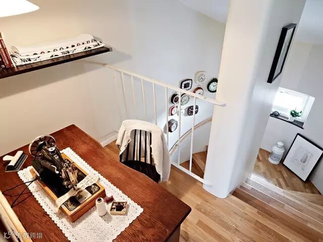 原木打造的螺旋楼梯放置一台缝纫机,居家的味道立马体现出来了。偶尔小憩,可以在白色篱笆边的阳台下喝茶看书,多么地享受人生!