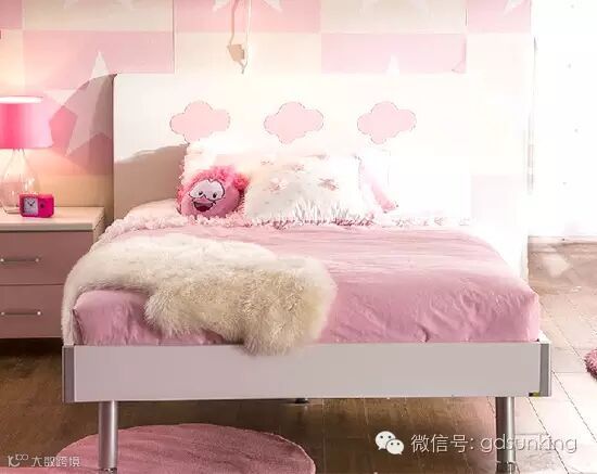 此款儿童床包括了床头柜和两门衣柜,一整套三件儿童房家具协调搭配,省去了另外配搭的麻烦。此款儿童床为淡粉色,充满少女情怀,云朵图案十分可爱,温馨唯美。儿童床为排骨架结构,稳固安全,承重能力强。