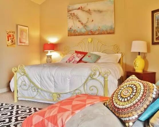 在主卧室理,用新的灯罩取代了之前的两个二手床头灯,瓶身已被粉刷成金黄色和瓷白色,青铜床架略显优雅。墙上的海报时刻提醒着他们每隔一年就要进行一次家庭旅行。