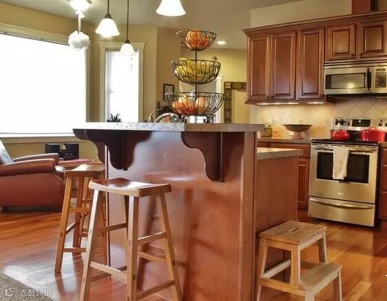 厨房的空间布局足够大所以不需要再扩展,橱柜的材料使用樱桃色木地板,凸起的面板橱柜为厨房提供了充足的存储空间。