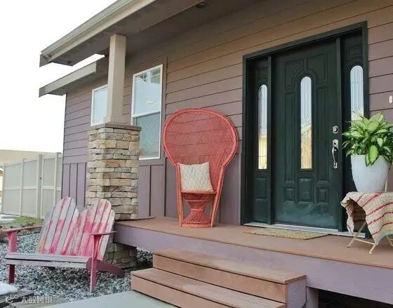 房子的外观比较有特点,它是由木墙板和复合顶板共同建造的。门廊的右边摆设着精心挑选的植物盆栽,左边放置了一张休闲竹藤座椅,主人可以在这里度过闲暇的下午时光。
