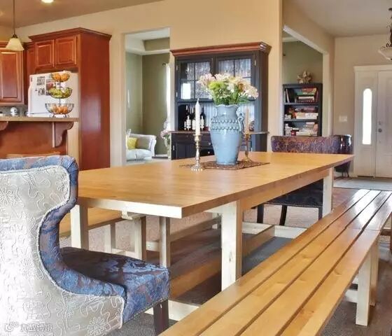 宜家的超大餐桌很实用,可以作为家庭娱乐、聚餐、游戏、以及做作业的地方。 餐厅的另一边是家庭的音乐室,配有鼓和钢琴。