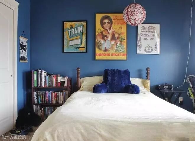 因为儿子十分沉迷摇滚乐队,所以他收藏了很多乐队的海报,这些海报与深蓝色的墙壁形成了鲜明的对比。房间里简单地摆设了一张大床和一个小书架。