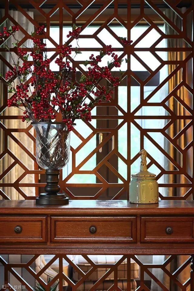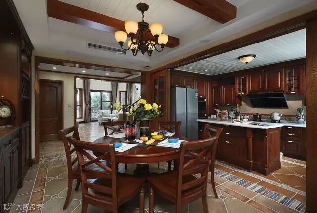 本案设计大量采用枣色原木感,墙面硅藻泥营造原始自然质感,以及考虑空间环保。精选仿古砖的搭配设计,棉麻布艺窗帘以及美式布艺沙发也是本案设计中一个非常注意的风格搭配。着重通过这些自然质感的元素去强调“回归自然”的乡村朴实风味。厨房六扇推拉门设计,使得在四川特有餐饮环境下,厨房与餐厅既有开放感,又可以杜绝油烟串味。圆形餐桌,是由房屋主人提出大家庭和睦相处的情感诉求,主卧套房设计再一次给予业主精品生活的无限可能。