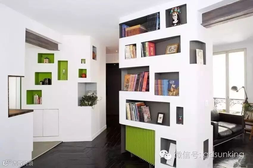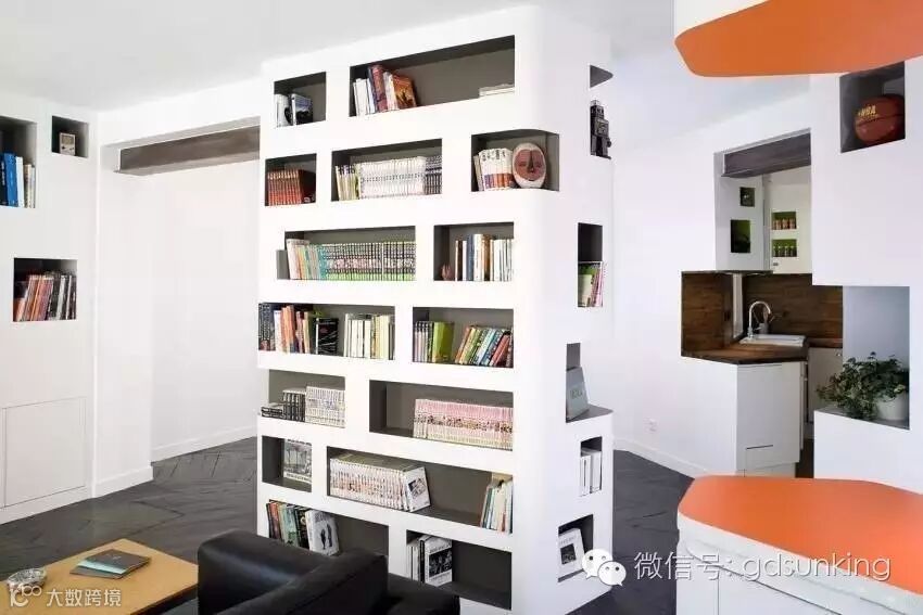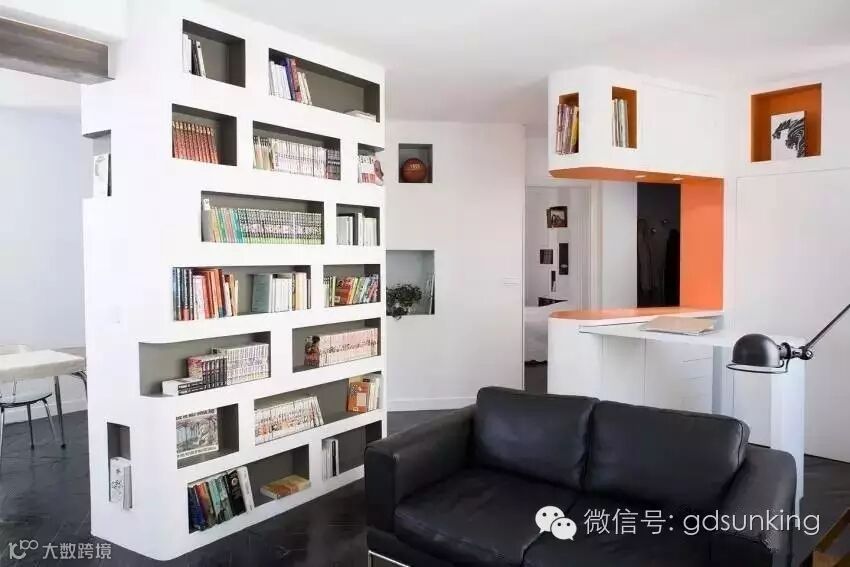 套小户型公寓卫浴发过巴黎,采用了新奇的现代家具和不寻常的墙体结构组成。整体设计以现代白为主色调,打造清新安静的氛围。以定制书柜作为客餐厅的墙体隔断,且在增强收纳功能的同时,将书柜打造成几何混乱的形状,条块分割,顺理成章地成为这个空间里独一无二的装饰品。