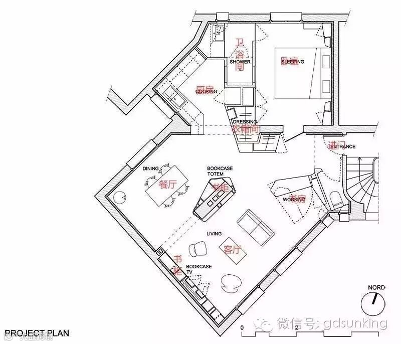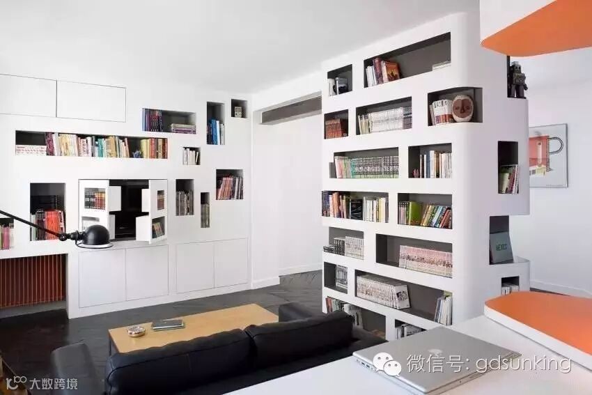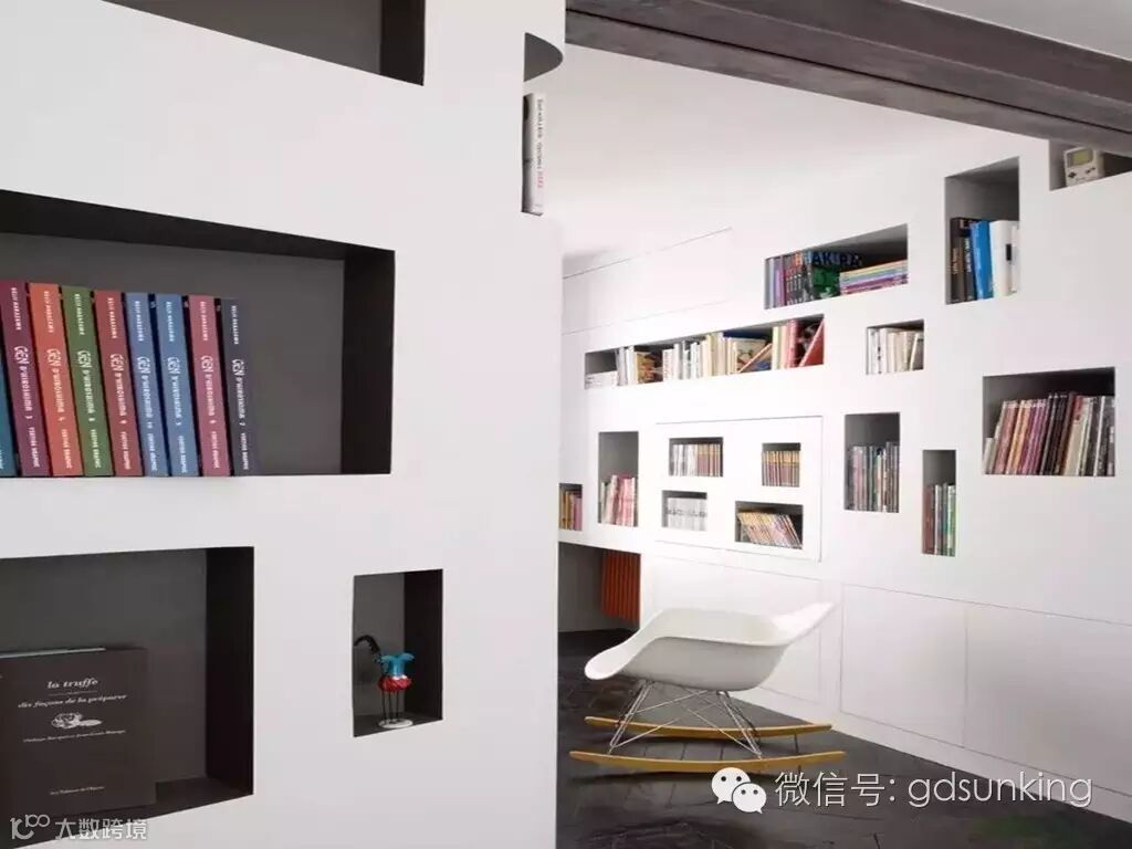 这套公寓,户型较为奇葩,因此在该空间的中心设置了几何形状不规则的书柜,起到了不同功能空间的隔断效果,又充分散发书香味。
