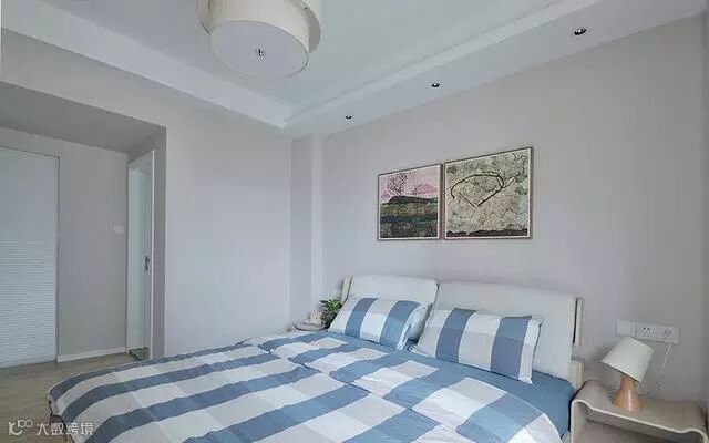 条纹被品符合居室整体风格,格子柜的设置方便床边收纳。
