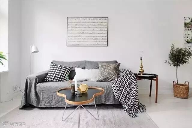 沙发用灰色布料随意盖起,靠枕选用几何图案,摩登感十足。小巧的不规则形状茶几与环境搭配恰到好处,角落里的白色落地灯低调又实用。