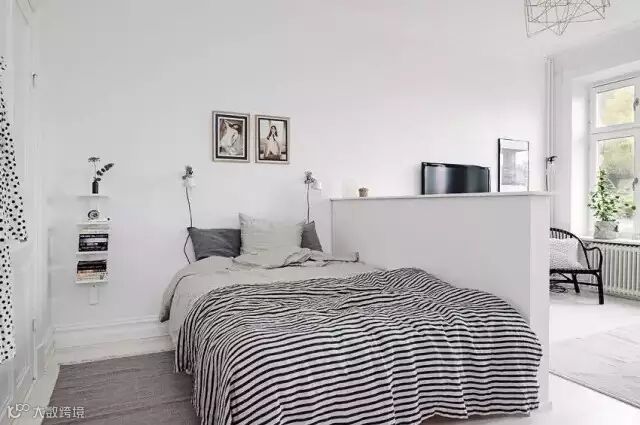 卧室由隔墙简单隔出。这样的隔断方式适合所有小户型,既不阻挡光线,也让空间立显规整。