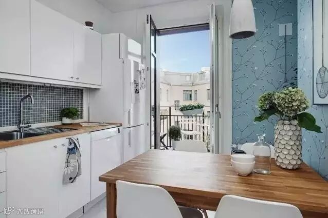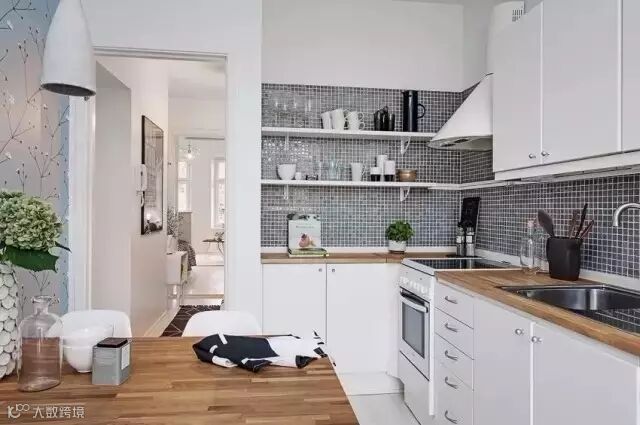 厨房和餐厅自成一体。厨房背景墙为黑色格子图案,跟普通的大白墙相比,更具设计感。瓷砖的材质也让厨房油污更好清理。