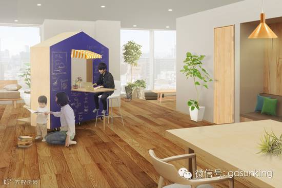 这种设计专门结合了时下日本年轻夫妇居住和生活的空间。其中包括几种不同类型的设计的风格,他们把这种叫做co-ba...一种专属家庭的...融合工作与生活的自由空间