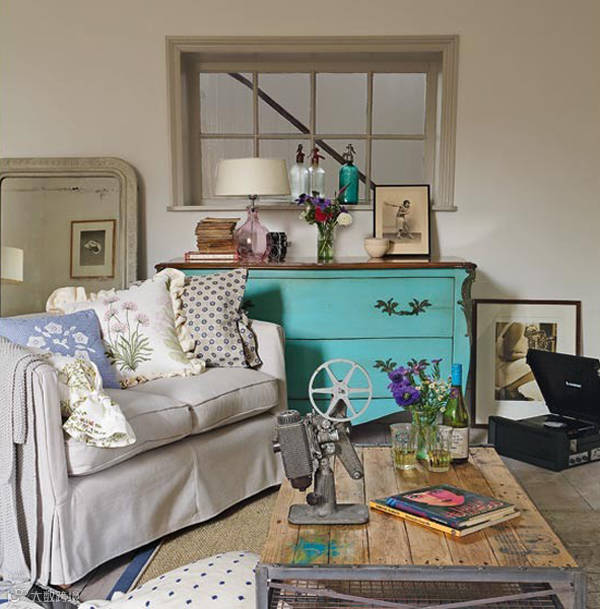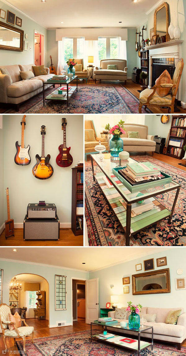 17 | 形状多样的相架、不同色调的沙发、椅子都是复古风格的特色。客厅的设计相当的引人注目,这样的设计风格如果能应用在咖啡厅里,效果绝对赞!