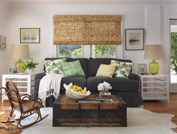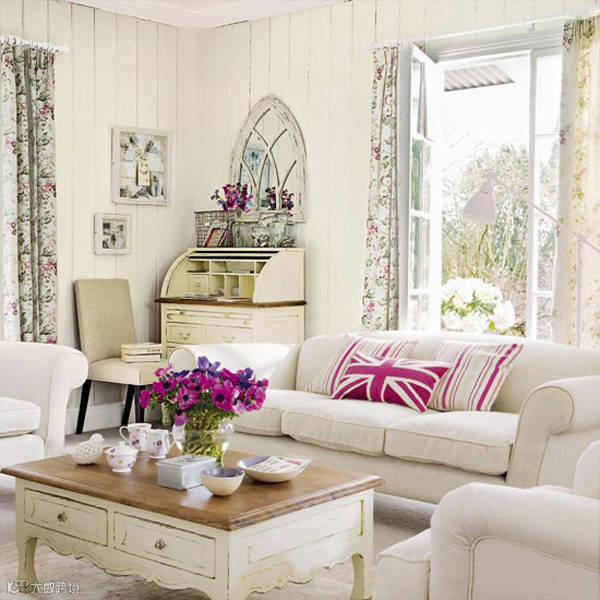 20 | 褪色印花的回归,褪色印花的窗帘就是一种特别的复古单品,舒适淡雅的传统沙发和颜色鲜艳的抱枕形成了鲜明的对比。设计联
