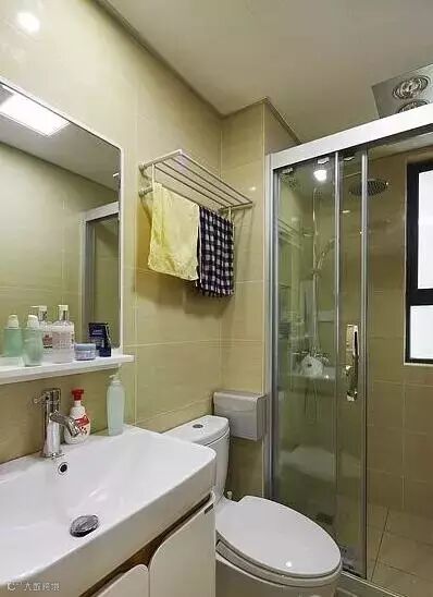 卫生间很小也做了干湿分离,透明的玻璃门不会显得拥挤,也能增加采光,小而全。