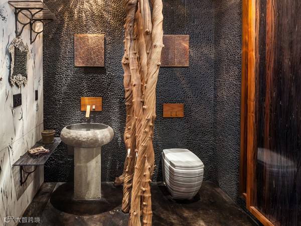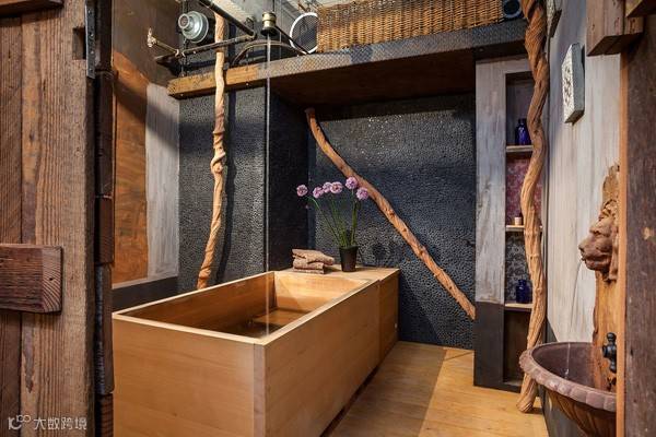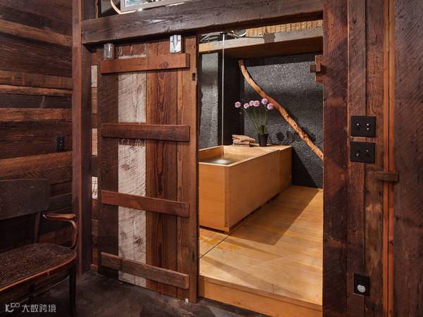 浴室墙壁覆盖着天然的黑色鹅卵石,日式浴缸成了卫生间的焦点,雪松木地板和谷仓的门,干葡萄树脂板“自然主题”给人一种特别时尚的外观。