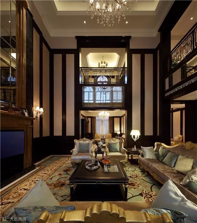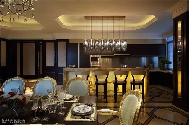 一层最大亮点是吧台区,采用意大利天然纹样大理石作为背景。硬朗直线线条穿插于客厅整个空间中与法式古典家具、软装艺术品相互呼应,共同演绎着古典而又不失沉稳内涵的奢华空间。