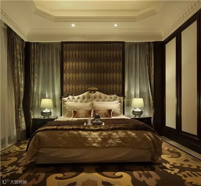 二层主卧墙面背景花纹图案,搭配极具夸张图案的花纹地毯绽放贵族的奢华气息,室内精美的家具在丝绸质感的床上用品的映衬下一点都不显得呆板,反而显得更尊贵和奢华。
