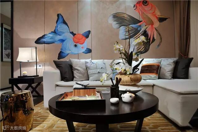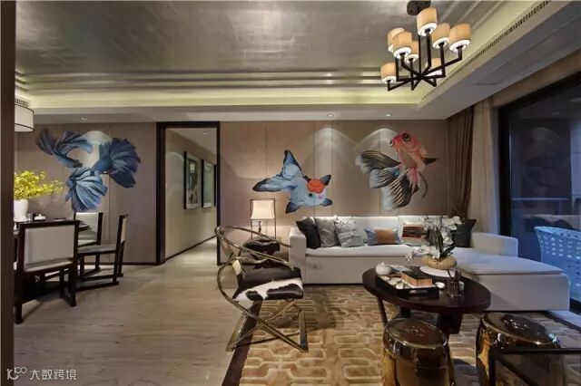 新中式风格特点不是纯粹的传统元素堆砌,而是通过对传统文化的认识,将现代元素和传统元素结合在一起,以现代人的审美需求来打造富有传统韵味的事物,让传统艺术在当今社会得到合适的体现。本案位于杭州临安,是一个以新中式为主题风格打造的创意样板间。设计师将人们喜闻乐见,富有吉祥寓意的“鱼”元素融入其中,从色彩、材质和饰品的搭配上,营造家居空间的文化艺术氛围。