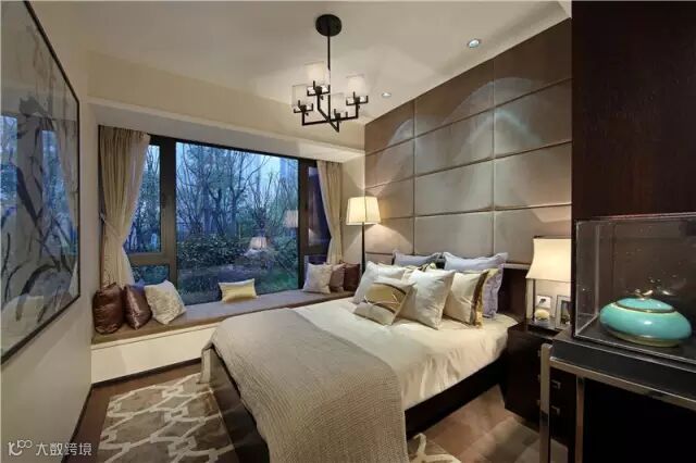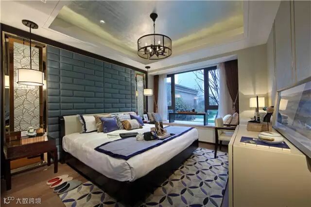 主卧细节处简中有繁,繁中带简,透着巧夺天工又不失自然的气息,对称的金色屏风搭配藏青色的中式仿青砖型的扪布造型显得沉稳而贵气。
