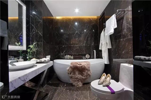 卫浴空间地面和墙身选用深啡色石材,搭配白色的石材台面和白色的洁具,显得干净整洁。