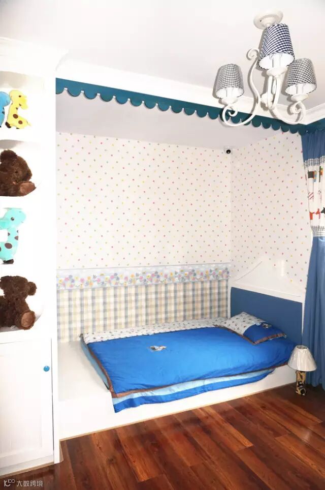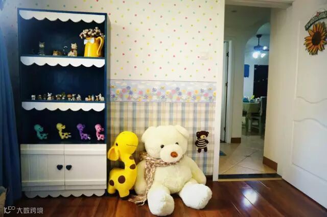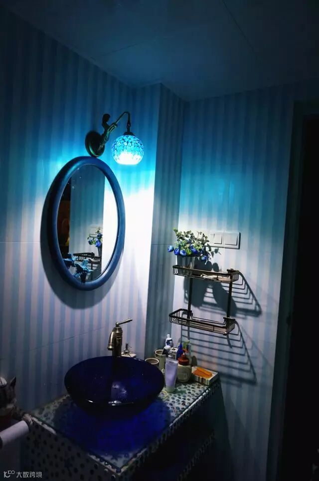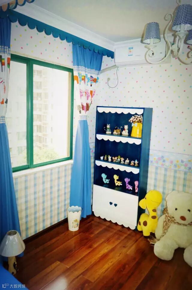 【设计理念】:儿童房蓝色衣柜位置原来硬装是做了层架的,但是这样就不好摆放衣柜了,我们认为摆放衣柜更实用些,所以就把它拆掉; 通过一些彩色海星,贝壳,栅栏,蓝色的布艺窗帘来达到地中海的感觉;为了解决洗手台上搞卫生的问题,在洗手台的上面加上一块透明的钢化玻璃,这样就不影原来的美观,又方便搞卫生。