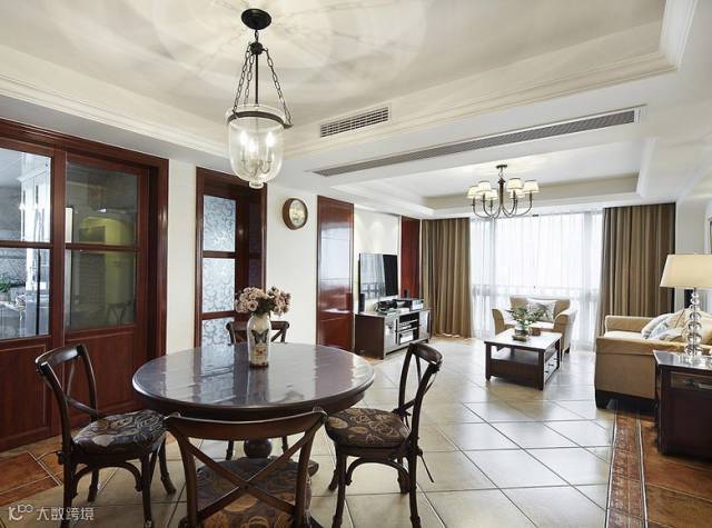 本案空间当中带着浓浓的乡村气息,以享受为最高原则,在布料、沙发的皮质上,强调它的舒适度,感觉起来宽松柔软,家具以殖民时期的为代表,体积庞大,质地厚重,坐垫也加大,彻底将以前欧洲皇室贵族的极品家具平民化,气派而且实用。