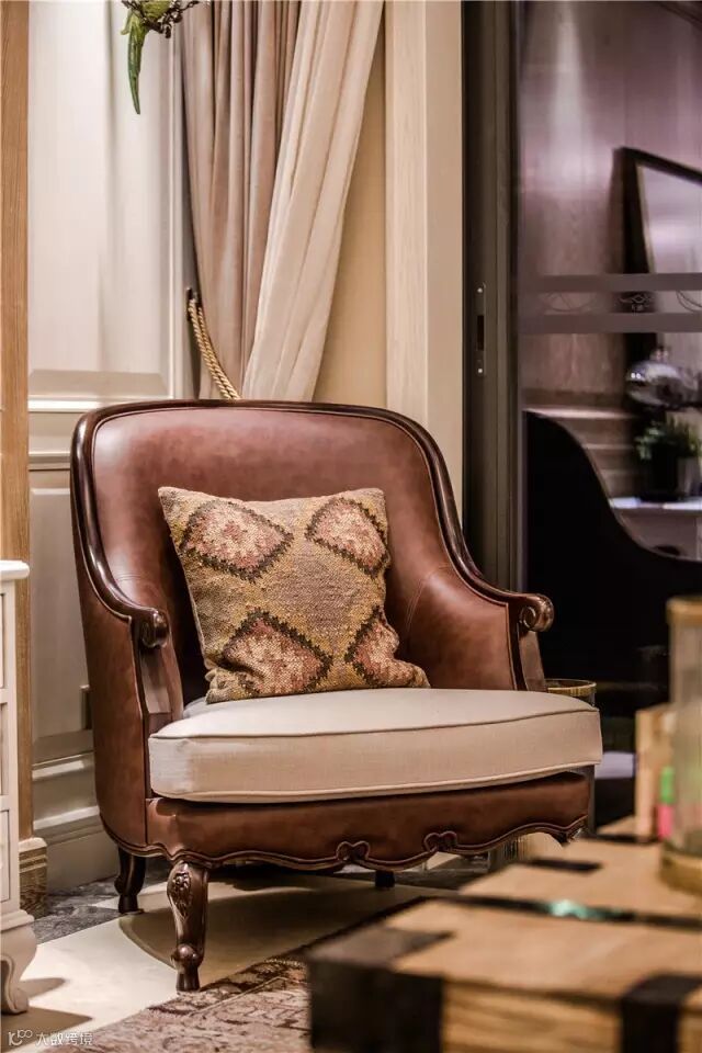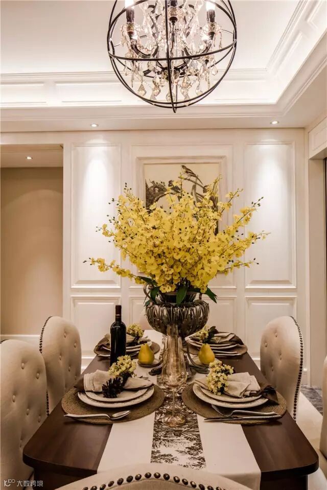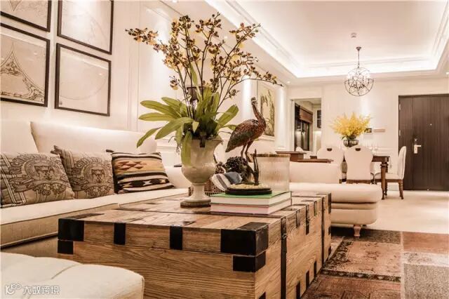 温润的原木驼色茶几与清爽的白色凹立面沙发搭配,令空间似清新幽然的栀子花,淡雅脱俗,整体空间对色彩的运用给人温和柔美的感觉。色彩搭配上以黄、灰暖色调为主;大地色系的地毯厚重,沉稳;玻璃、水晶、木材、铁艺等各种材料合理搭配,体现出南加州风格的简洁、原始,但又不缺乏细腻的美。