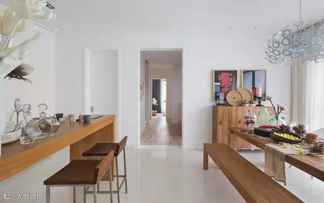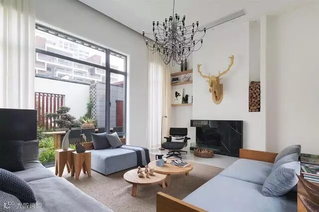 设计师精心挑选每一件器皿、花艺、装饰品,营造出原汁原味的北欧风情。憨态可掬的小木鸟或在圆桌上成群蹲守,或在树枝上独自停驻,带来一幕幕生动有趣的画面;墙上的驯鹿头像、维京题材油画,排列整齐的圆木,则将人不由自主地带入北欧原始、质朴的生活情境中,行走室内,仿佛时时有北欧的清风拂面而来。