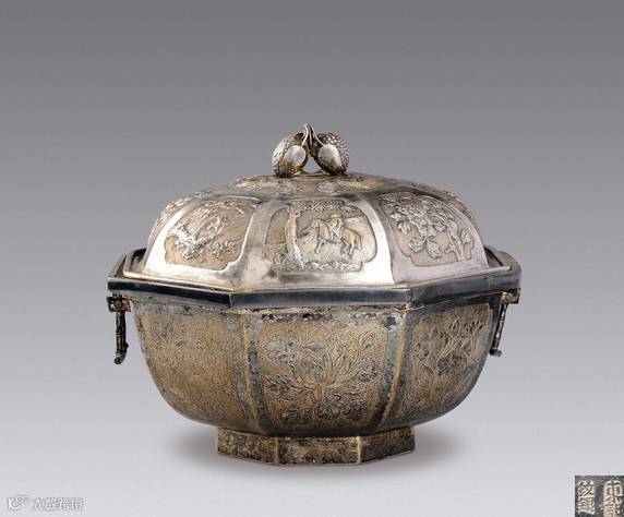 清 花鸟人物纹八角形银温碗
