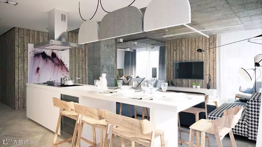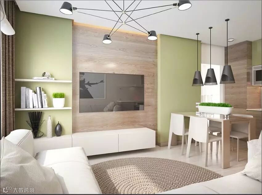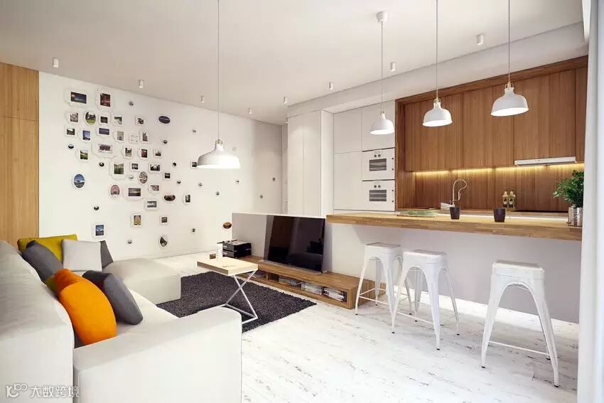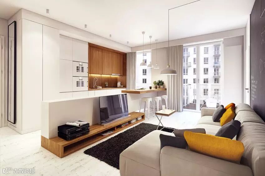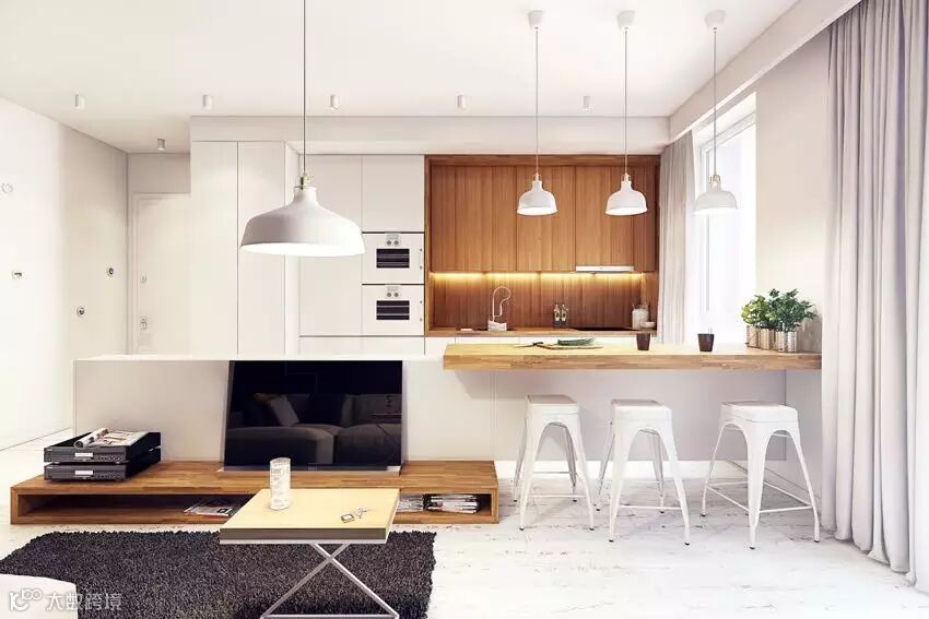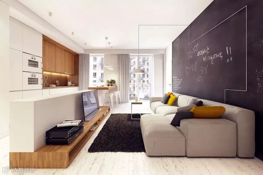 在小空间里如何创造格局又不觉得压抑?下面这间住宅通过对墙面高度的调整,将客厅、厨房,利用电视墙和吧台连成一道矮墙,创造出新格局的同时又没有压迫感,并且加入造型的变化和储物功能。浅色墙面和地板提高了空间的明亮感,这也在视觉上起到了放大空间的作用。简单别致的设计带来自然清新的舒适环境!