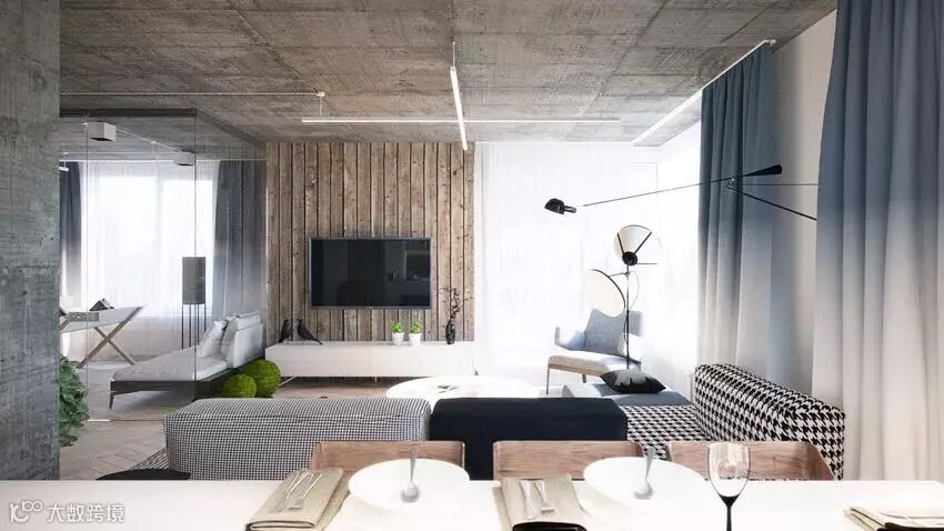 水泥墙不仅是工业风的专属,清新现代的公寓风也可以使用水泥墙来增加原始的自然质感。下面这间公寓用水泥墙搭配最具自然气息的木地板和局部的木墙面装饰,黑白灰和地彩度的灰蓝色调,给人一股无压力的清新感,让家的一切化繁为简。踏进家门就能有沉静、清新、放松的感觉。材质和色彩的搭配是清新现代公寓的重要元素哦~