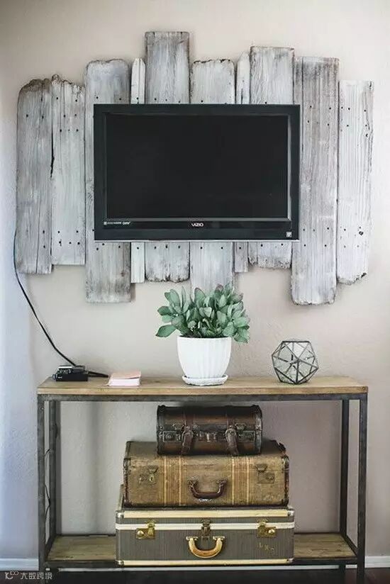 回收的旧地板做的背景墙,还有旧皮箱,旧物的二次利用是复古乡村风格的宗旨。