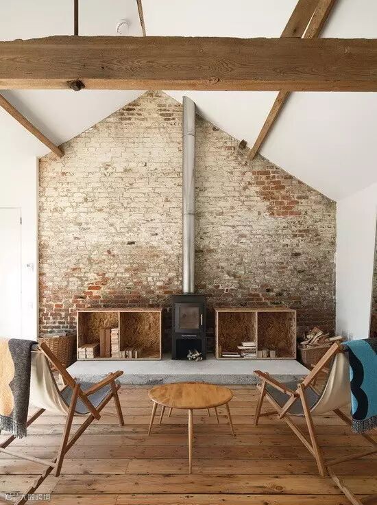 白墙和裸露在外面的木梁是英式乡村风格中常见的场景。纯实木的休闲椅,包装箱改制的书架,乡村、环保,回归自然。