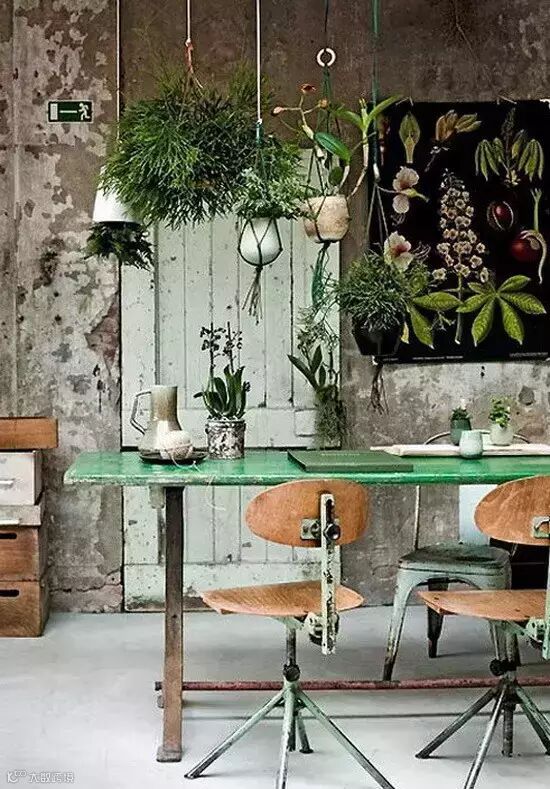 因为绿植的加入,乡村风格才焕发出生机。桌椅也刷成了仿古绿,和悬挂的绿植相映成趣。