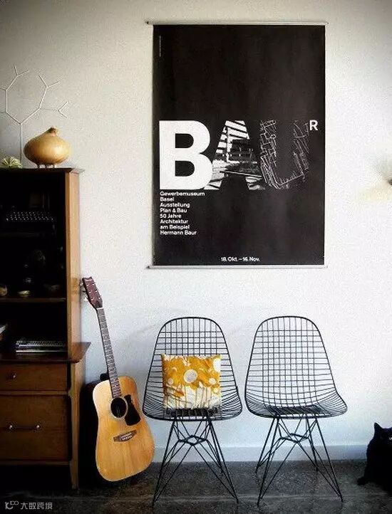 复古的室内设计包含了太多的平面设计灵感。经典的铁条休闲椅,墙上的黑白招贴画画,很酷,很时尚!