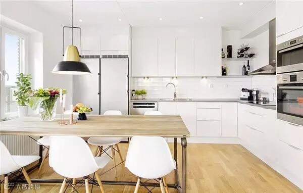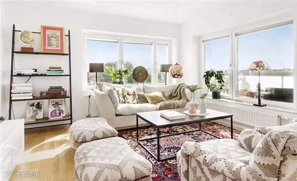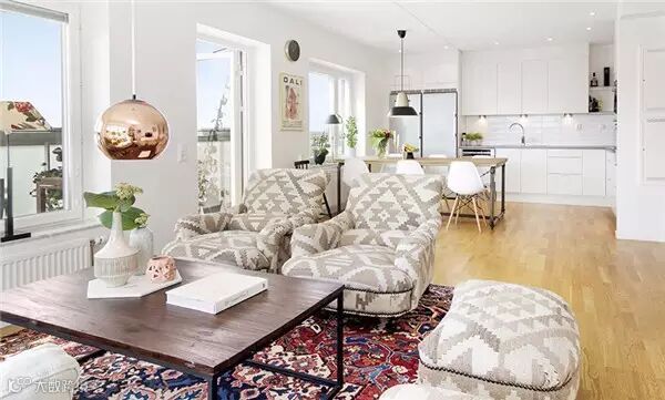 看看这间公寓是如何在简约风格增加民族风元素的。天花板以及壁面,都是选用无彩度的白色,作为空间主色调,舒适的木质地板,更是给人温暖的感受。而客厅选择具有图腾感的布面沙发,与色彩丰富的民族风地毯,搭配窗边的特色摆饰,让一片白色简约风格中,增添许多异国风情。