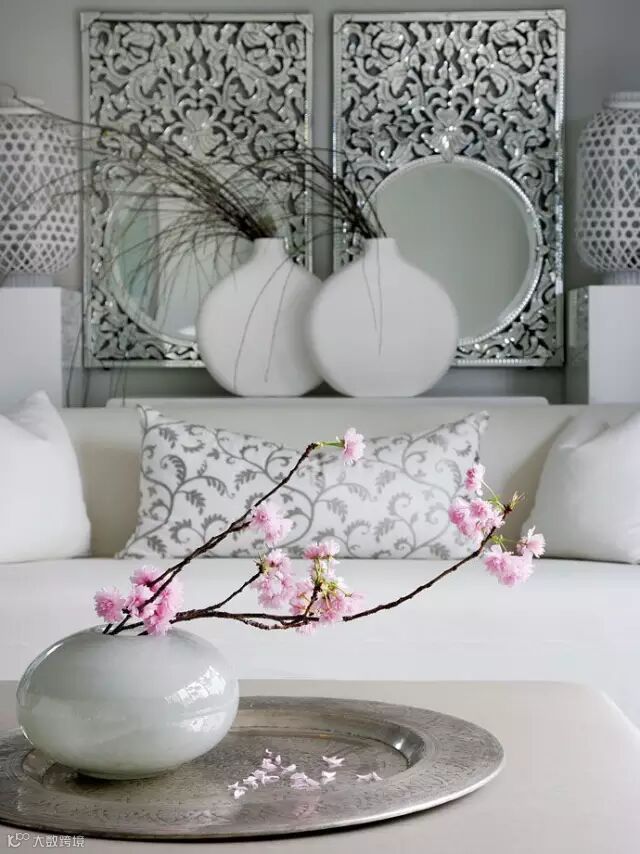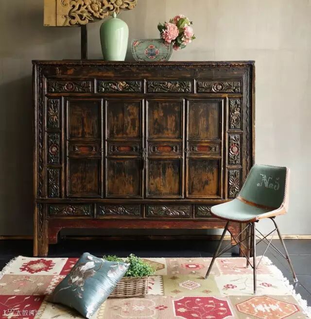 边柜主要是玄关,门廊,和空间墙体空白填充家具的功能,此花艺的高度与人的视点等高,所以是花艺中运用最广泛的陈列形式。主要展示面是在其正面,所采用的是扁平的体量形式。