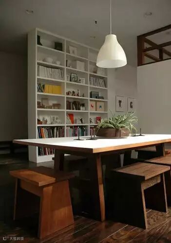 大桌子搭配一个书柜,可以减少「餐厅」感,让空间更生动。